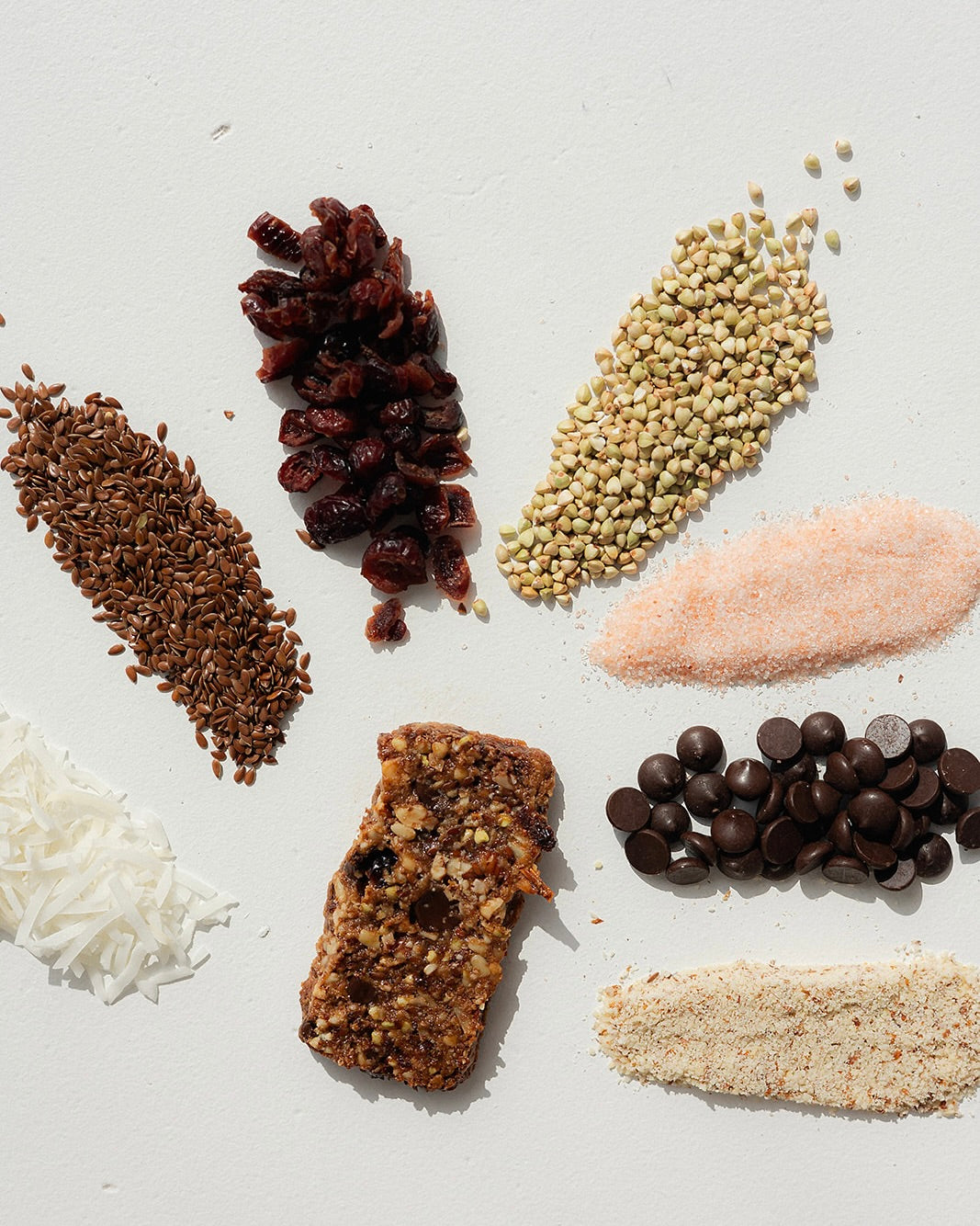 Seed & nut blend (Australian almonds, sunflower seeds, Australian pumpkin seeds, flax seeds, buckwheat), brown rice syrup, almond flour, dark chocolate (cocoa mass, sugar, cocoa powder, soy lecithin)(9%), cranberries (cranberry, apple juice*, sunflower oil*)(9%), coconut*, macadamia oil, Himalayan pink salt